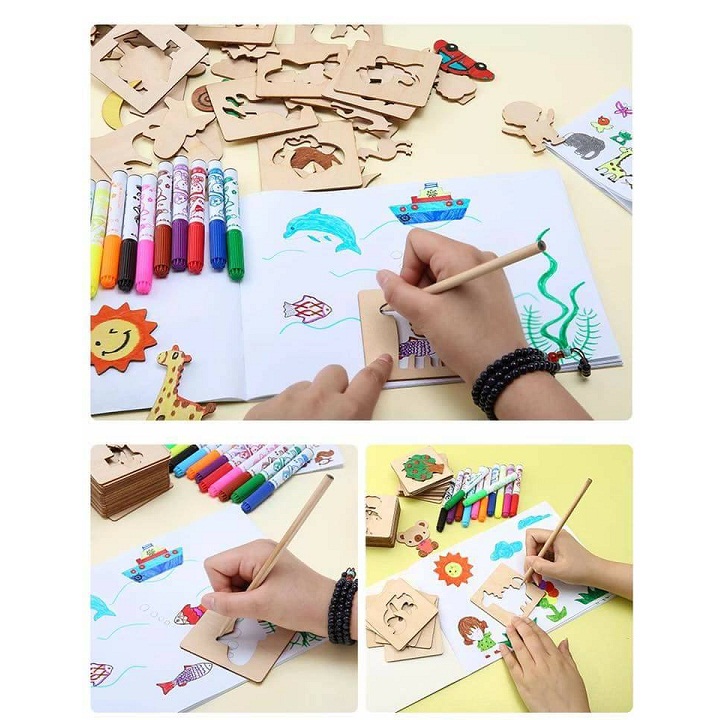 Bộ đồ chơi bao gồm: giấy vẽ, chì vẽ, các khung hình bằng gỗ khoét các hình con vật, cây cỏ, ngôi nhà, mặt trời… vô cùng đáng yêu cho bé vẽ nên những bức tranh hoàn hảo theo ý thích của bé.