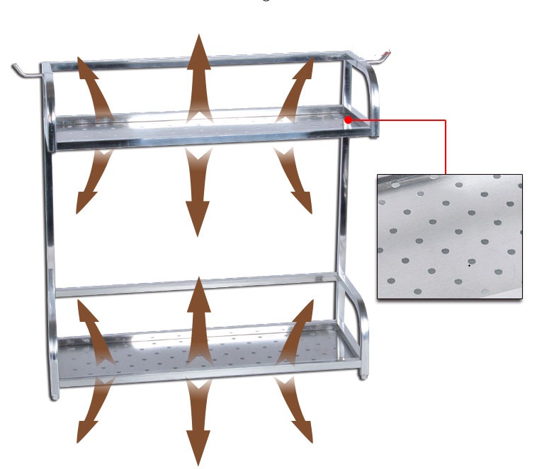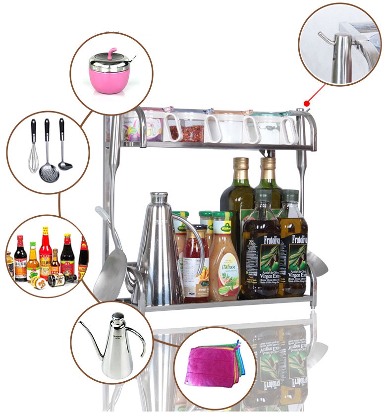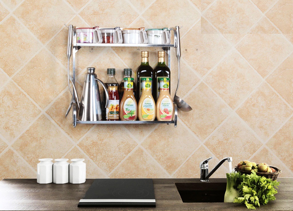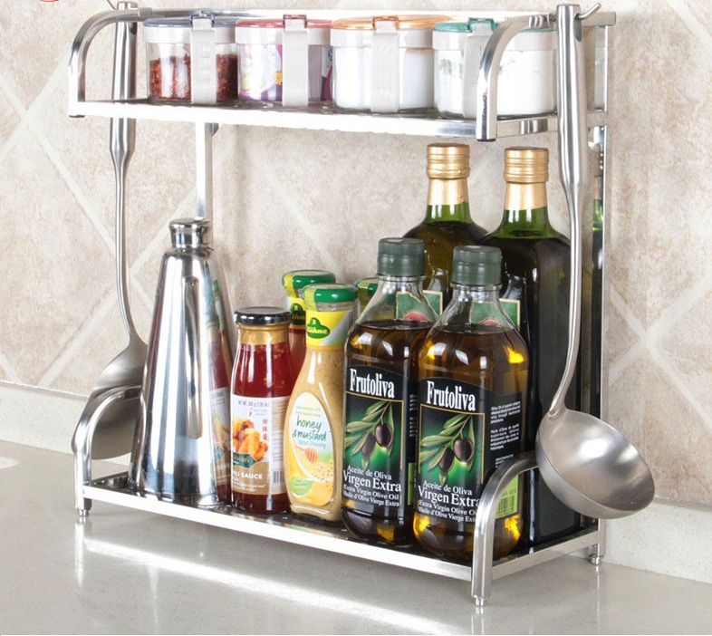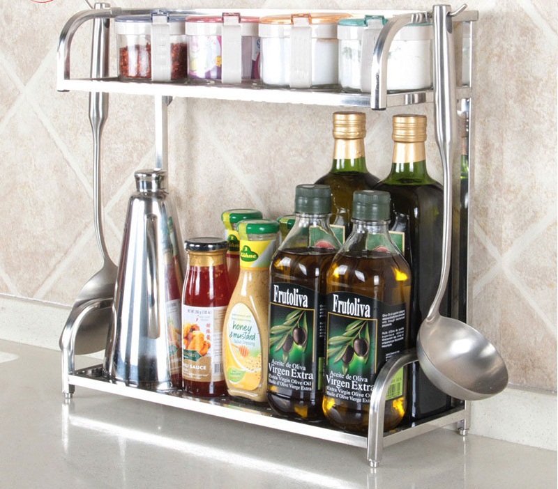 – Với 2 tầng tiện lợi, thiết kế theo kích thước của những chai gia vị, dao thớt. Vì vậy chai lọ được giữ chắc chắn không bị nghiêng đổ.